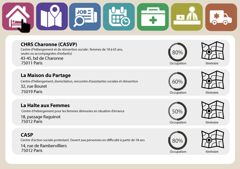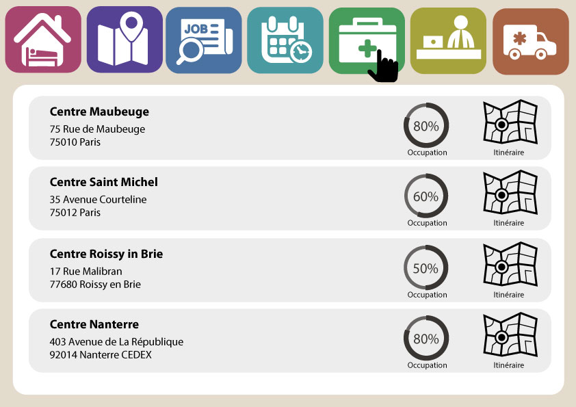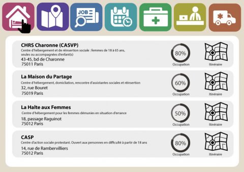 - Centres d’accueil : description des centres d’hébergement de la ville, leur taux d’occupation et l’itinéraire à partir de la borne.