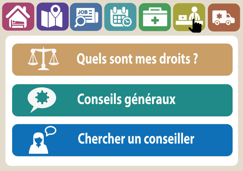 - Conseils : rubrique comprenant des informations générales, un récapitulatif des droits auxquels les sans-abris peuvent prétendre en fonction de leur situation et des conseillers adaptés à leurs besoins.
