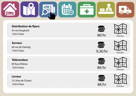 - Offres d’emploi : différentes offres d’emploi pour des petits jobs avec le salaire et l’itinéraire pour se rendre à l’endroit concerné.