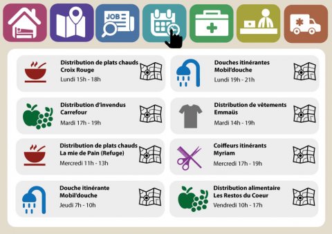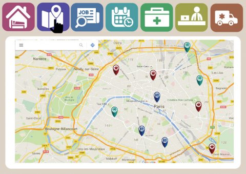 Pour remédier à cela, nous proposons un système de bornes tactiles réparties sur les points stratégiques de la ville et permettant aux sans-abris d’avoir accès à des informations adaptées à leurs besoins. Cette aide de proximité permettrait d’améliorer substantiellement leur qualité de vie et de favoriser leur autonomie et leur réinsertion. Il est essentiel que l’interface soit simple et intuitive : les différentes fonctionnalités seront représentées par des icônes claires et symboliques tandis que chaque fenêtre se focalisera sur les informations cruciales.