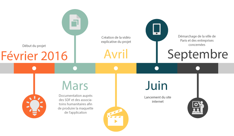 Dans les mois à venir, le travail principal sera sur le démarchage de la ville de Paris et des associations pouvant prêter main forte au projet. Concrètement, nous prévoyons le lancement du prototype de site internet courant juin. Pour rappel, ce site internet aura la double fonction de vitrine du projet et d’ajout d’événements par les associations humanitaires. Ces événements seront ensuite automatiquement mis à jour dans la partie “Évènement” de l’application.