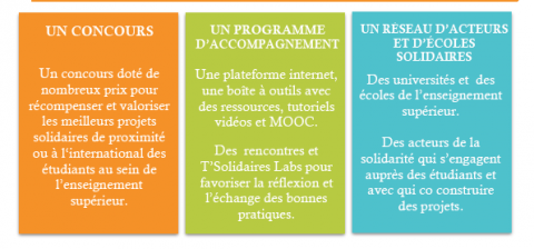 Lancés des acteurs de l’éducation et de la solidarité, les Trophées Solidaires veulent soutenir une dynamique d’engagement solidaire au sein de l’enseignement supérieur, et que cet  engagement soit valorisé dans le parcours personnel et professionnel des étudiants. Les Trophées Solidaires proposent un programme éducatif et un accompagnement spécifique au sein des écoles et universités qui rejoignent le réseau des écoles et universités solidaires : mises en contacts et rencontres avec des acteurs de la solidarité, ateliers «  T’Solidaires Labs », de réflexion et d’échanges d’expériences autour d’outils pédagogiques tels que les tutoriels vidéos et les MOOCs, Tous les étudiants engagés dans un projet de solidarité de proximité ou à l ‘international, peuvent profiter de la boite à outil développée sur la plate forme internet des Trophées, et  participer au concours, bisannuel. De nombreux prix, dotés de 15 000€  et autres avantages en nature sont proposés par Demain Nos Enfants, organisateur des Trophées, et ses partenaires tels que l’UNICEF, le groupe SOS, L’AFF, l’AFEV, ZupdeCo, la fondation Gloriamundi, le collectif ASAH et Youth WeCan  http://www.trophees-solidaire.fr